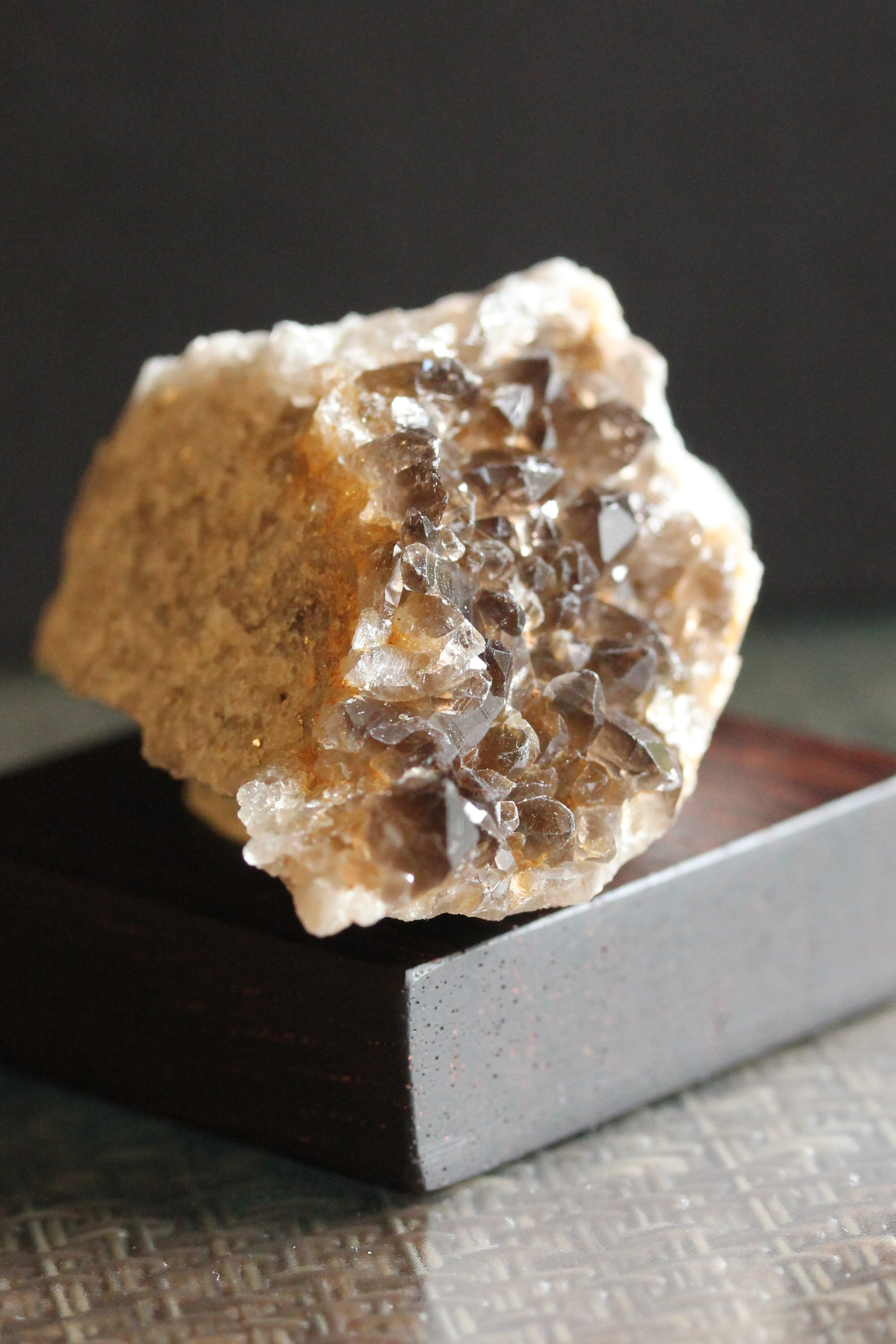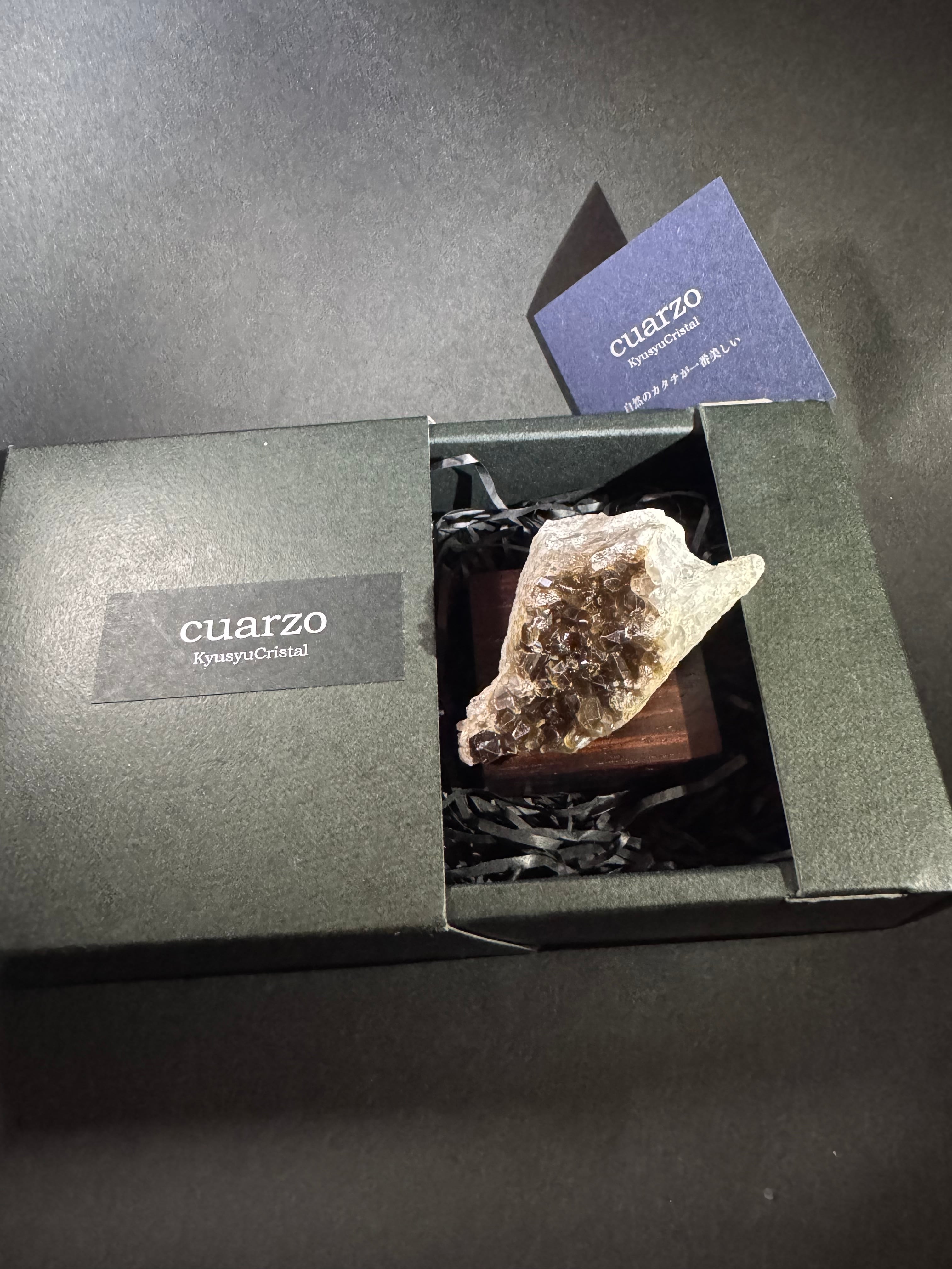 【商品説明】:煙水晶の原石と高級木材のローズウッドを使用した置物。モリオンほど漆黒ではないけけど、黒に近い透明感のある宮崎産煙水晶のミニクラスターです。単体の水晶でみると小さいですが、一つ一つがとてもキレイです。この産地の見本のようなクラスターです。ローズウッドベースの大きさ(約40x40x12mm)水晶を置く部分には「座ぐり」と呼ばれる円形の溝を掘っております。簡単のように見えますが、硬い木材のローズウッドに、一定の深さの溝を掘るには、非常に高度な技術を用います。木工歴50年の職人が成せる技です