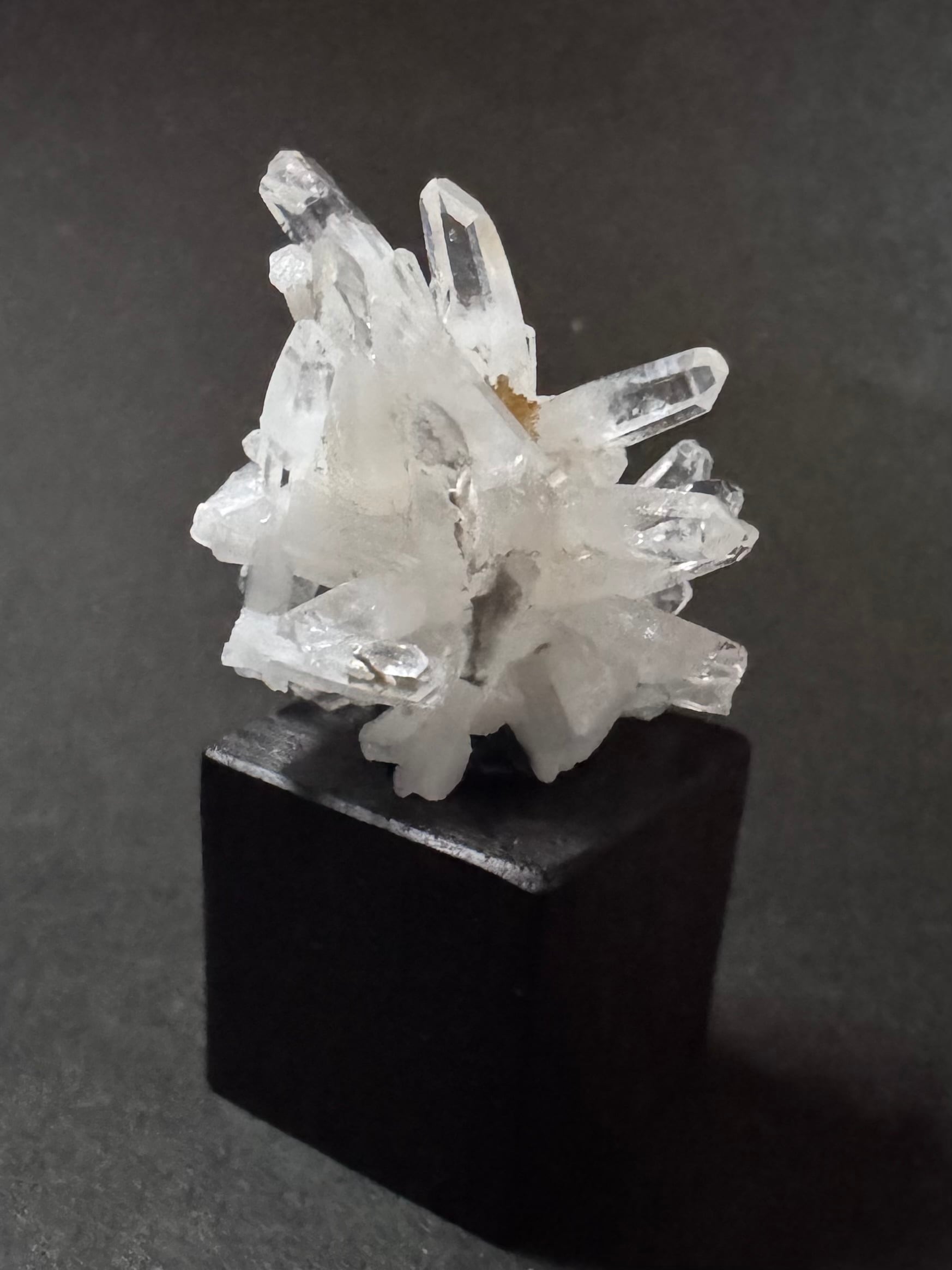 【商品説明】:クラスター水晶の原石と高級木材のローズウッドを使用した置物。様々な方向に自由気ままに伸びている大分産のミニ水晶クラスターです。各ポイントの先はとても透明度が高いです。ここの水晶は、スパっと輪切りにカットすると、断面が桜の花びらのような模様に見えるらしく、そのことから「桜水晶」と言われています。ローズウッドキューブの大きさ(約20x20x20mm)