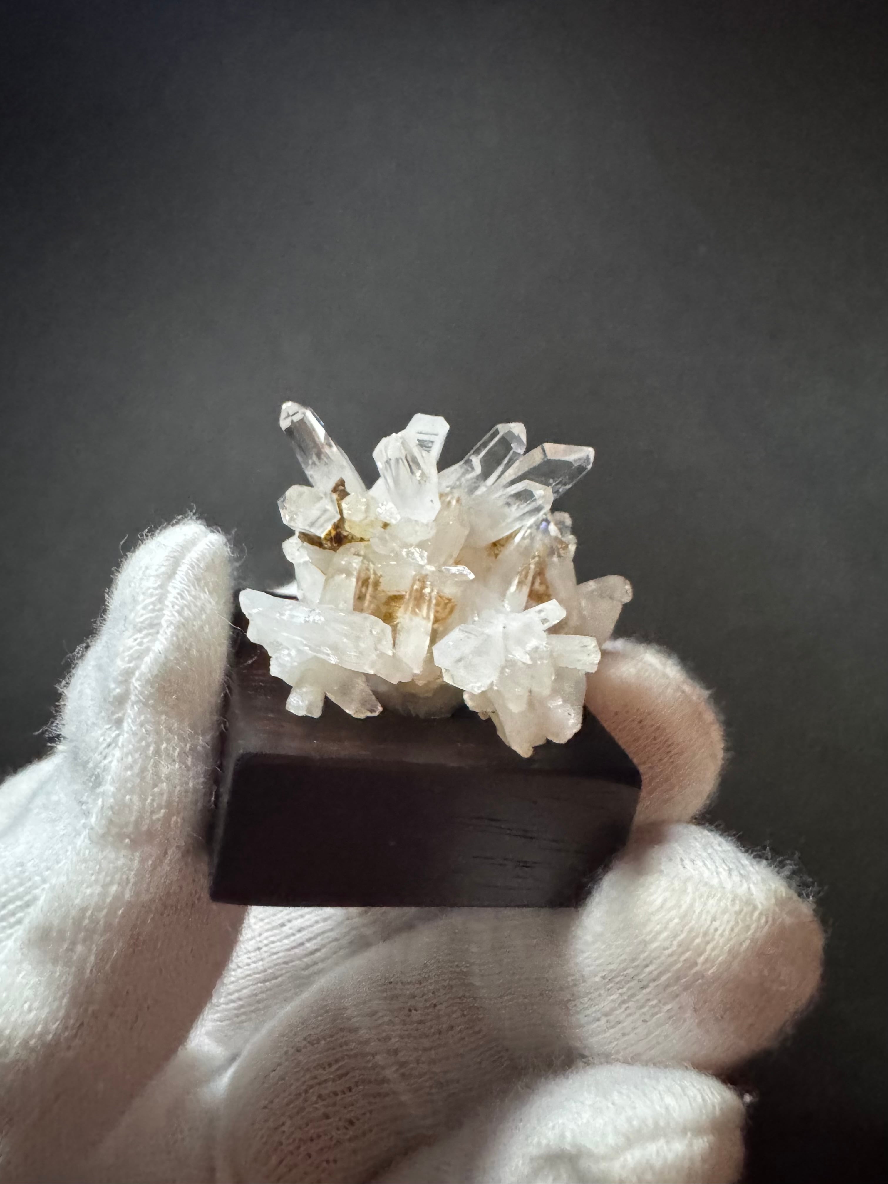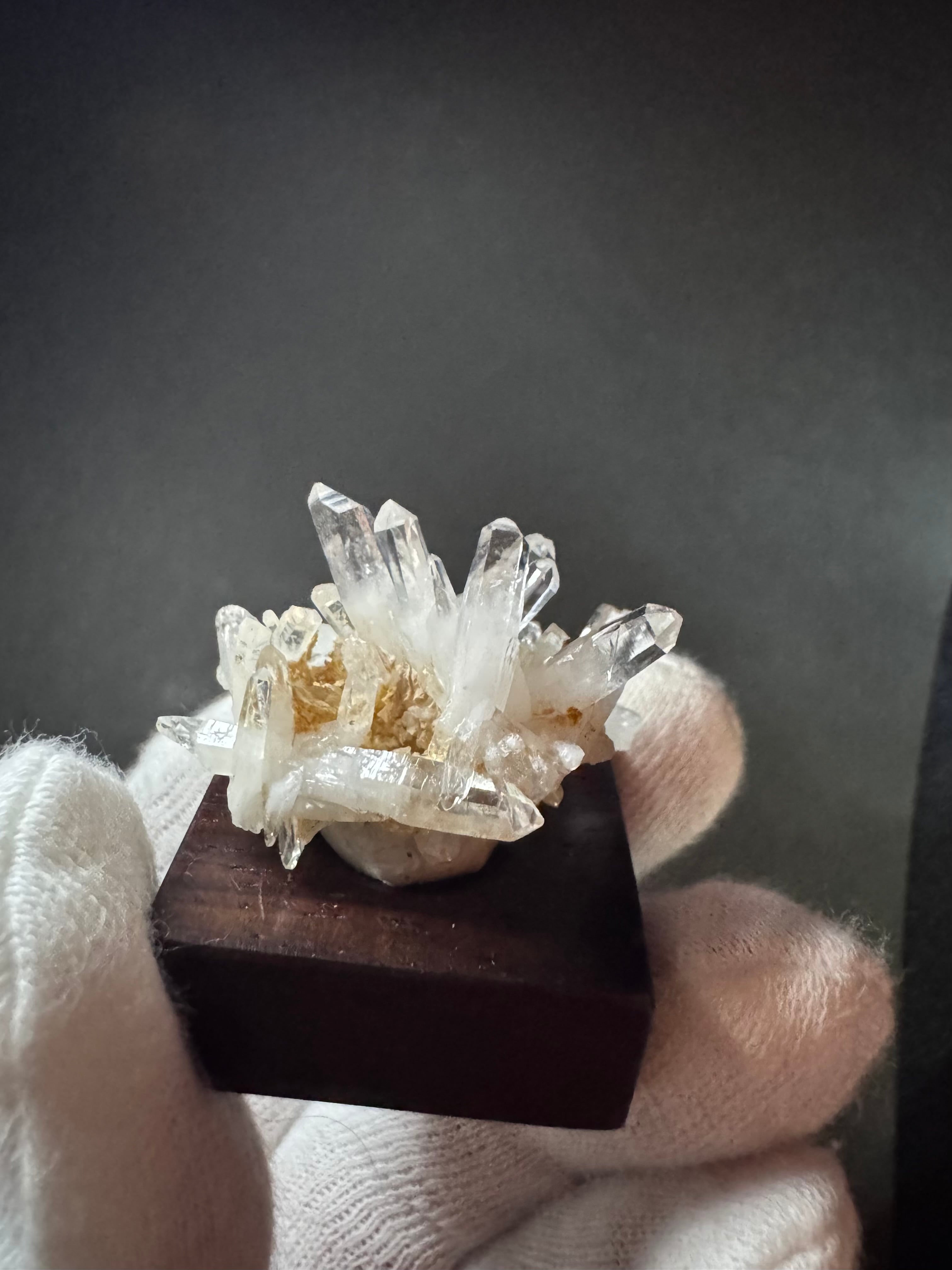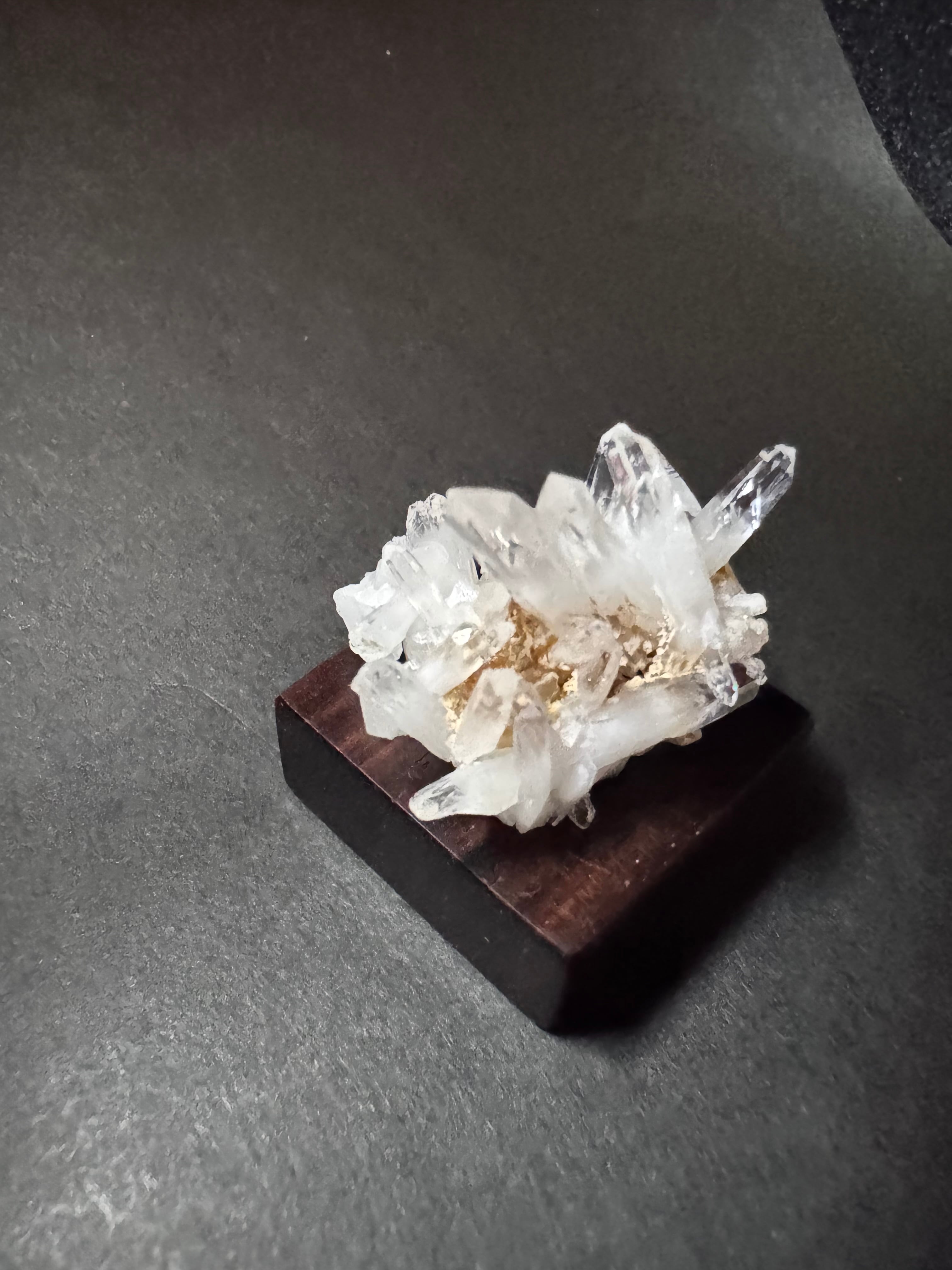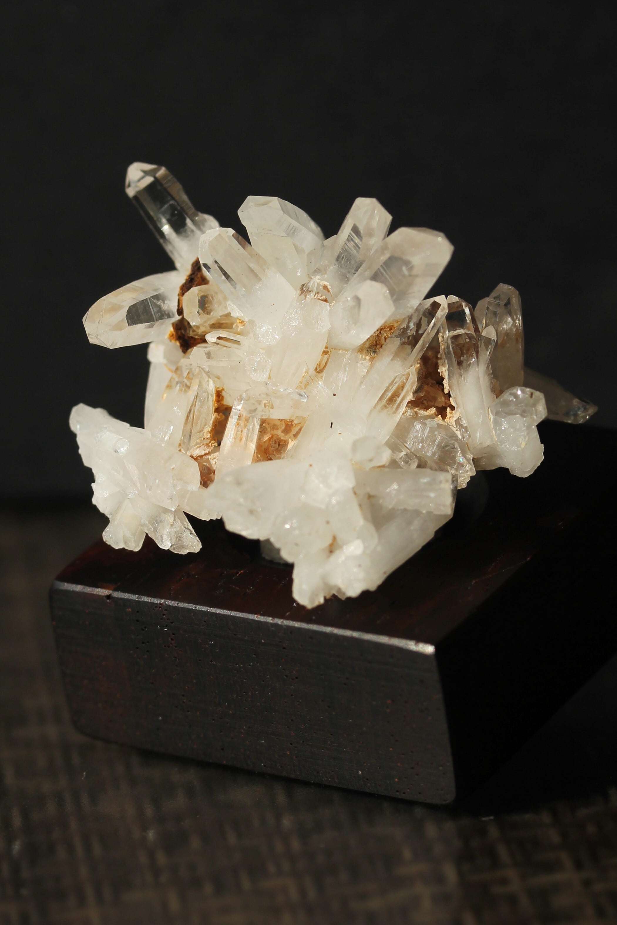 【商品説明】:クラスター水晶の原石と高級木材のローズウッドを使用した置物。様々な方向に自由気ままに伸びている大分産のミニ水晶クラスターです。各ポイントの先はとても透明度が高いです。ここの水晶は、スパっと輪切りにカットすると、断面が桜の花びらのような模様に見えるらしく、そのことから「桜水晶」と言われています。ローズウッドベースの大きさ(約30x30x12mm)水晶を置く部分には「座ぐり」と呼ばれる円形の溝を掘っております。簡単のように見えますが、硬い木材のローズウッドに、一定の深さの溝を掘るには、非常に高度な技術を用います。木工歴50年の職人が成せる技です
