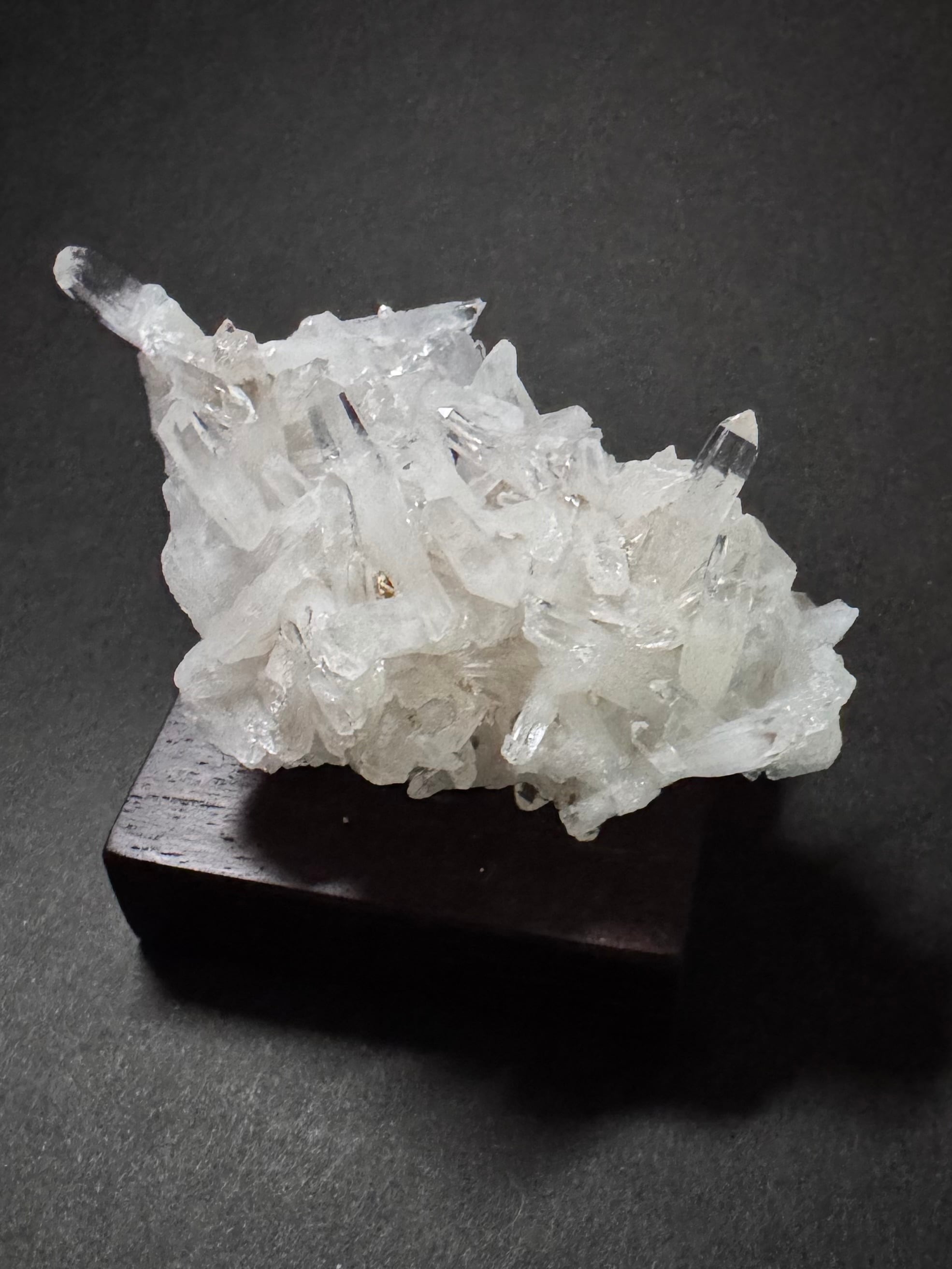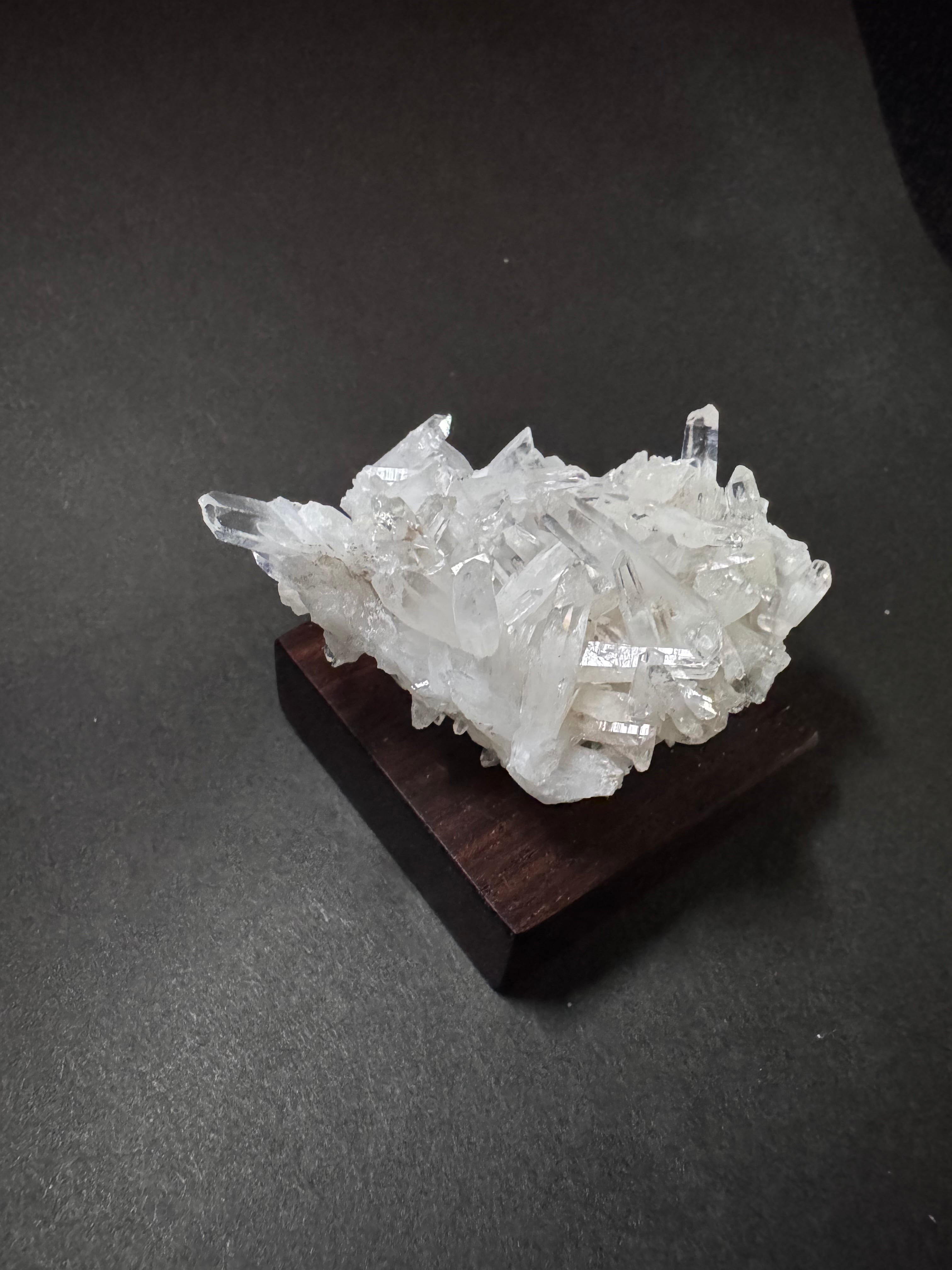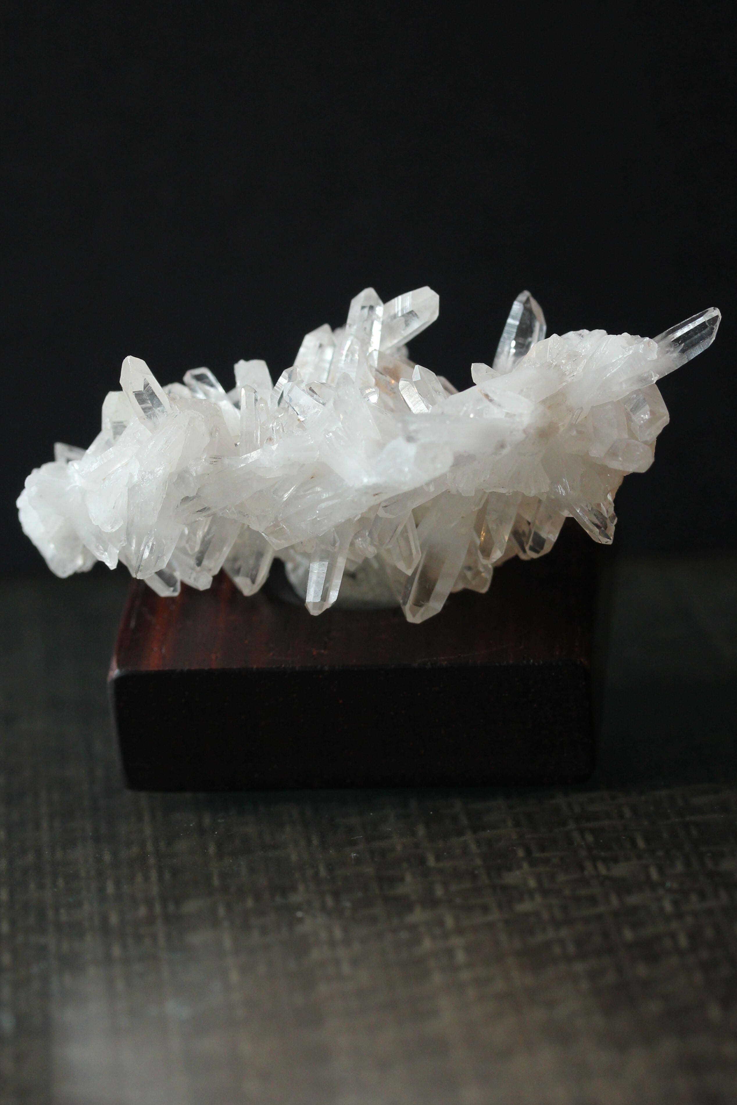 【商品説明】:クラスター水晶の原石と高級木材のローズウッドを使用した置物。無数に絡み合うかき揚げの様な大分産のミニ水晶クラスターです。各ポイントの先はとても透明度が高いです。ここの水晶は、スパっと輪切りにカットすると、断面が桜の花びらのような模様に見えるらしく、そのことから「桜水晶」と言われています。ローズウッドベースの大きさ(約40x40x12mm)水晶を置く部分には「座ぐり」と呼ばれる円形の溝を掘っております。簡単のように見えますが、硬い木材のローズウッドに、一定の深さの溝を掘るには、非常に高度な技術を用います。木工歴50年の職人が成せる技です