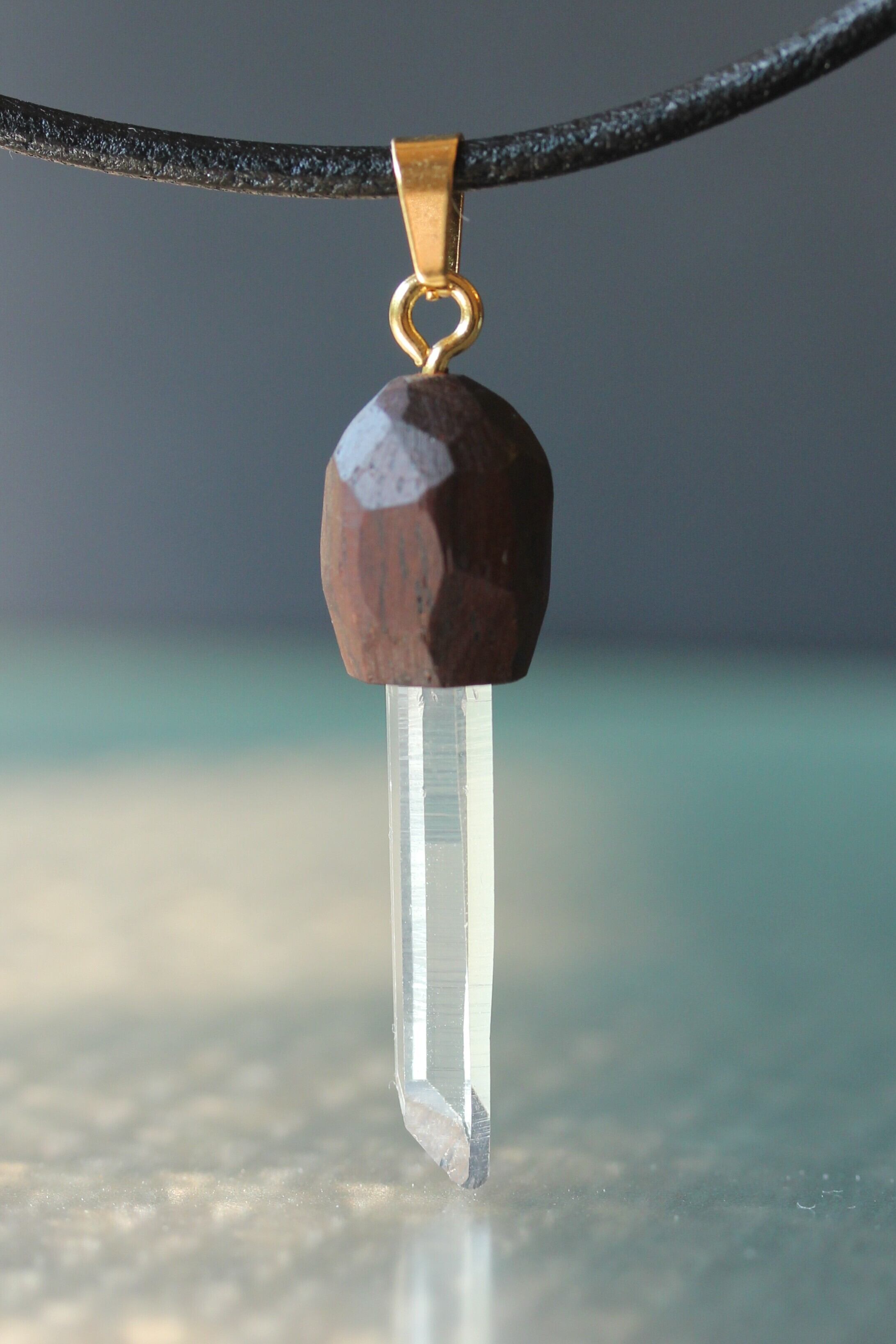 【商品説明】:水晶の原石と高級木材のローズウッドを使用したペンダント。コロンビアレムリアンを彷彿させるような透明度が高い宮崎産水晶。ギューンと伸びたポイント水晶がカッコイイです