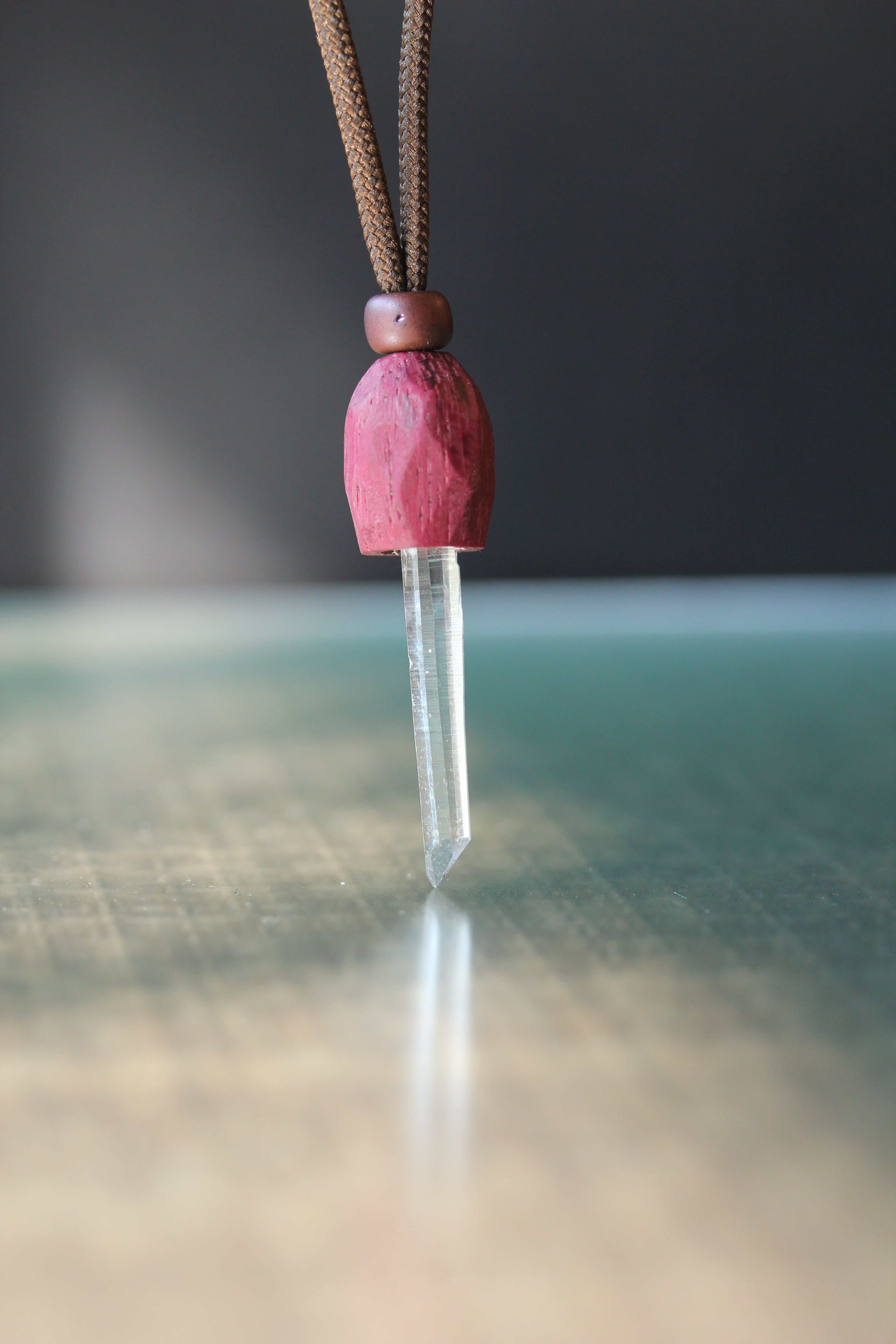 【商品説明】:水晶の原石と高級木材のパープルハートを使用したペンダント。コロンビアレムリアンを彷彿させるような透明度が高い宮崎産水晶。ギューンと伸びたポイント水晶がカッコイイです