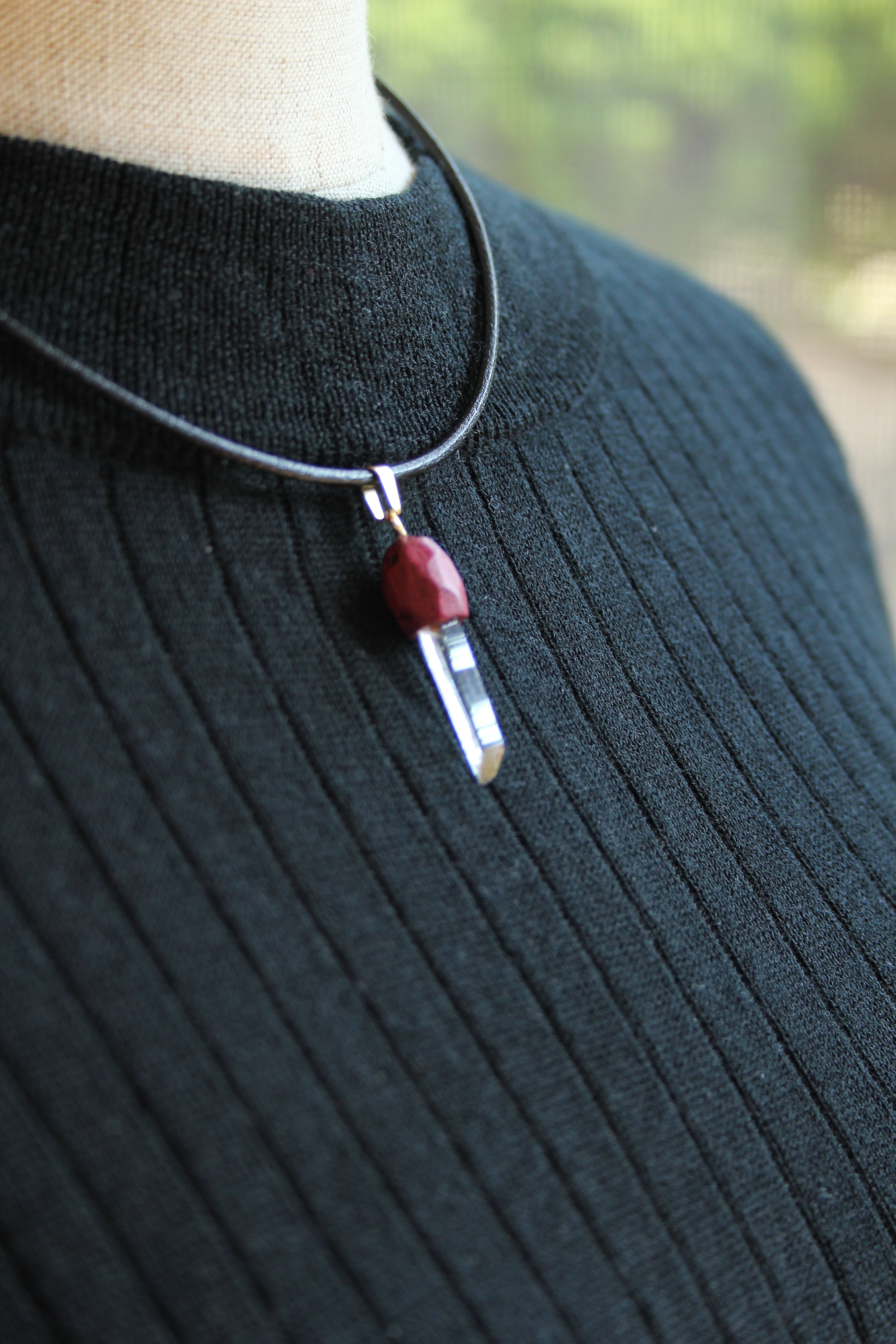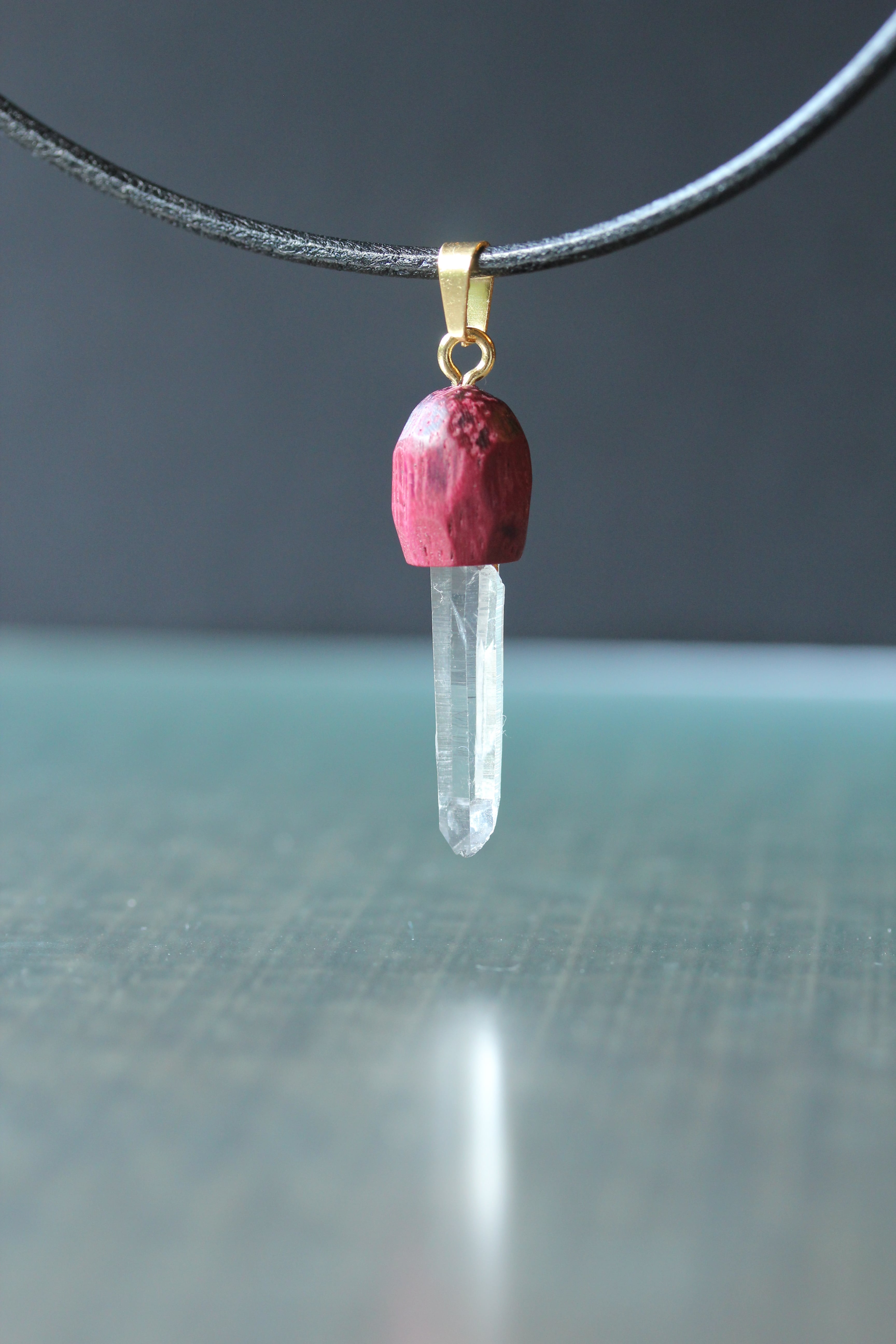 【商品説明】:水晶の原石と高級木材のパープルハートを使用したペンダント。コロンビアレムリアンを彷彿させるような透明度が高い宮崎産水晶。ギューンと伸びたポイント水晶に根元にチョイある山傷がカッコイイです