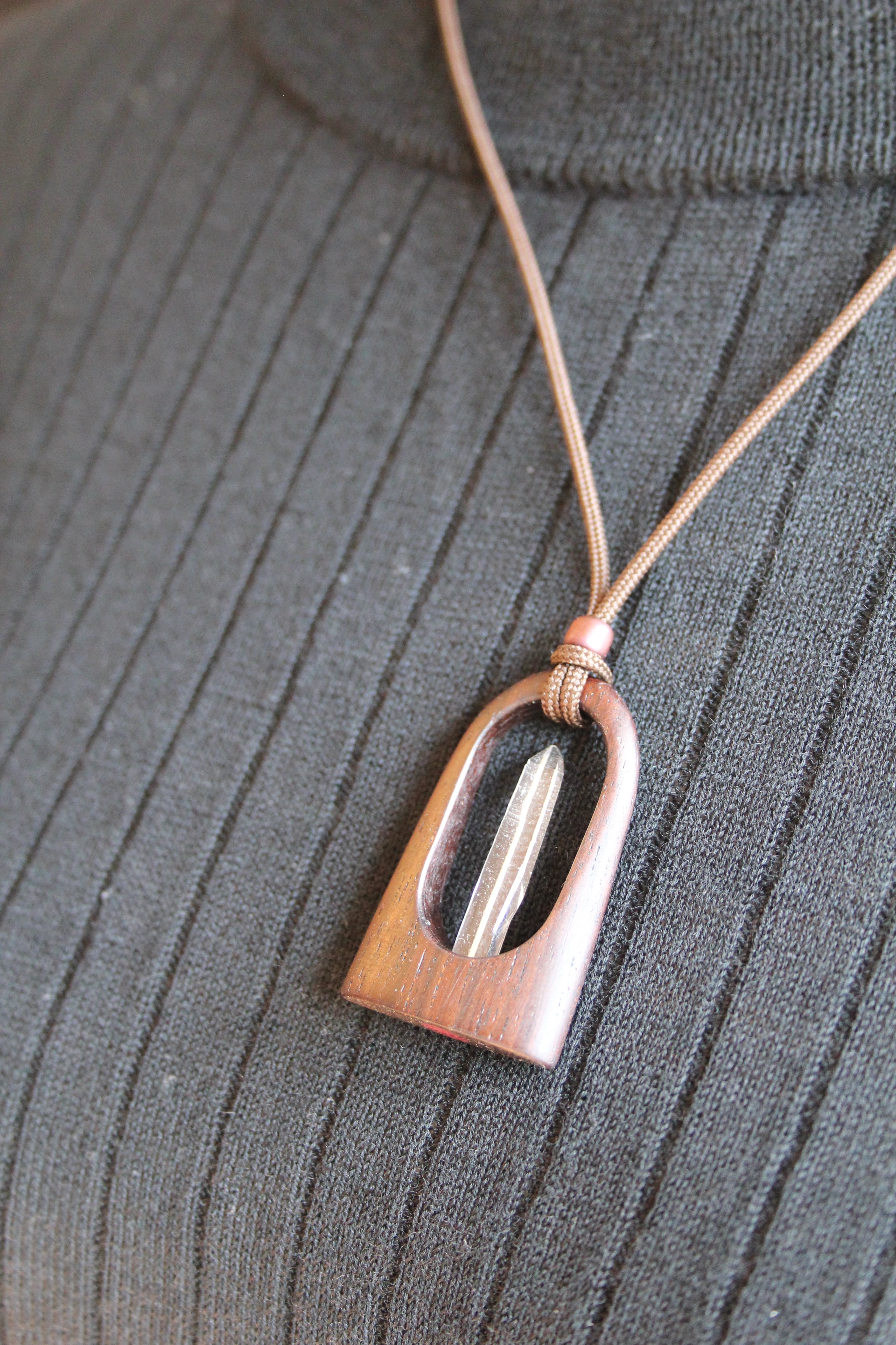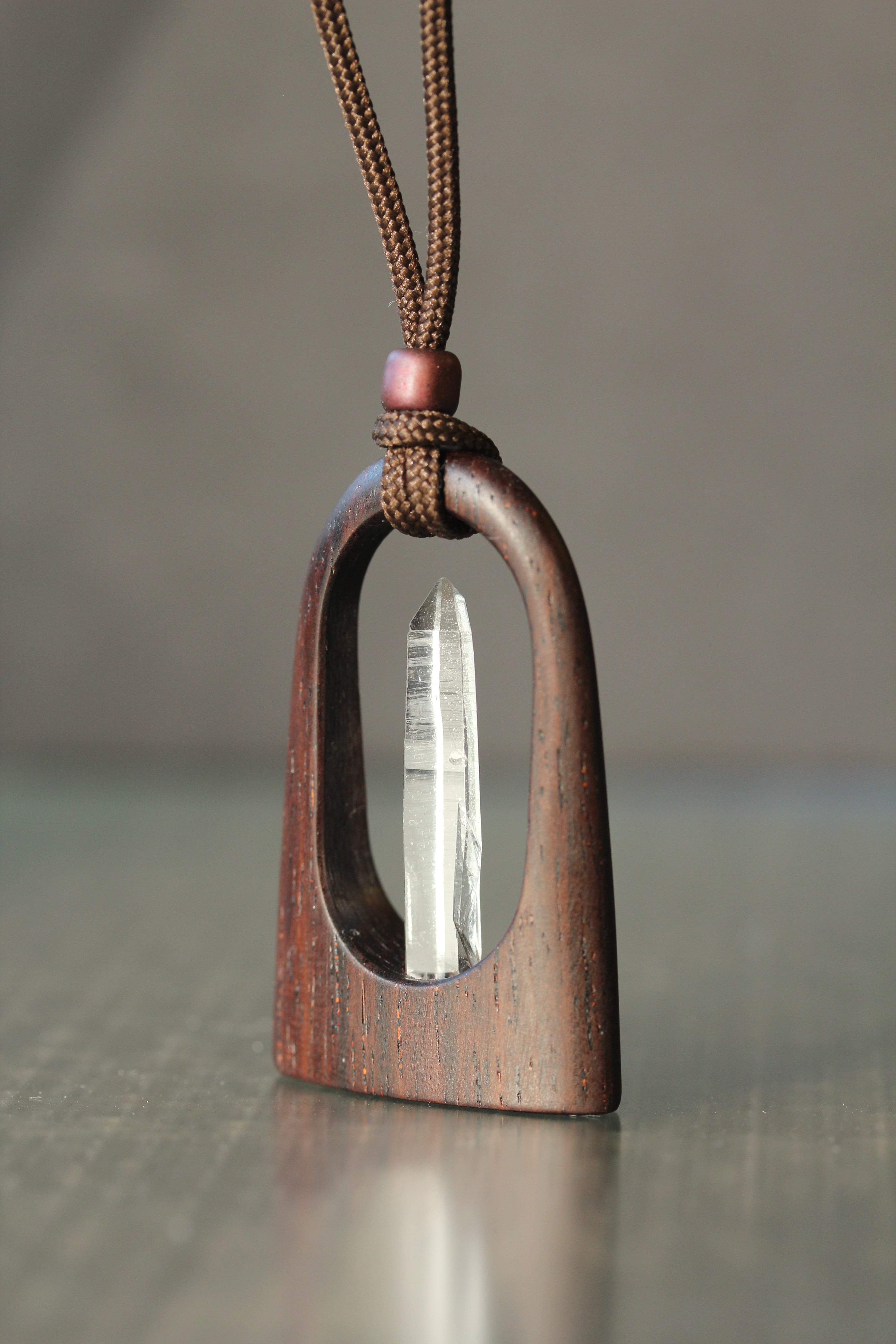 【商品説明】:水晶の原石と高級木材のローズウッドを使用したペンダント。コロンビアレムリアンを彷彿させるような透明度が高い宮崎産水晶。ギューンと伸びたポイント水晶に根元にチョイある山傷がカッコイイです