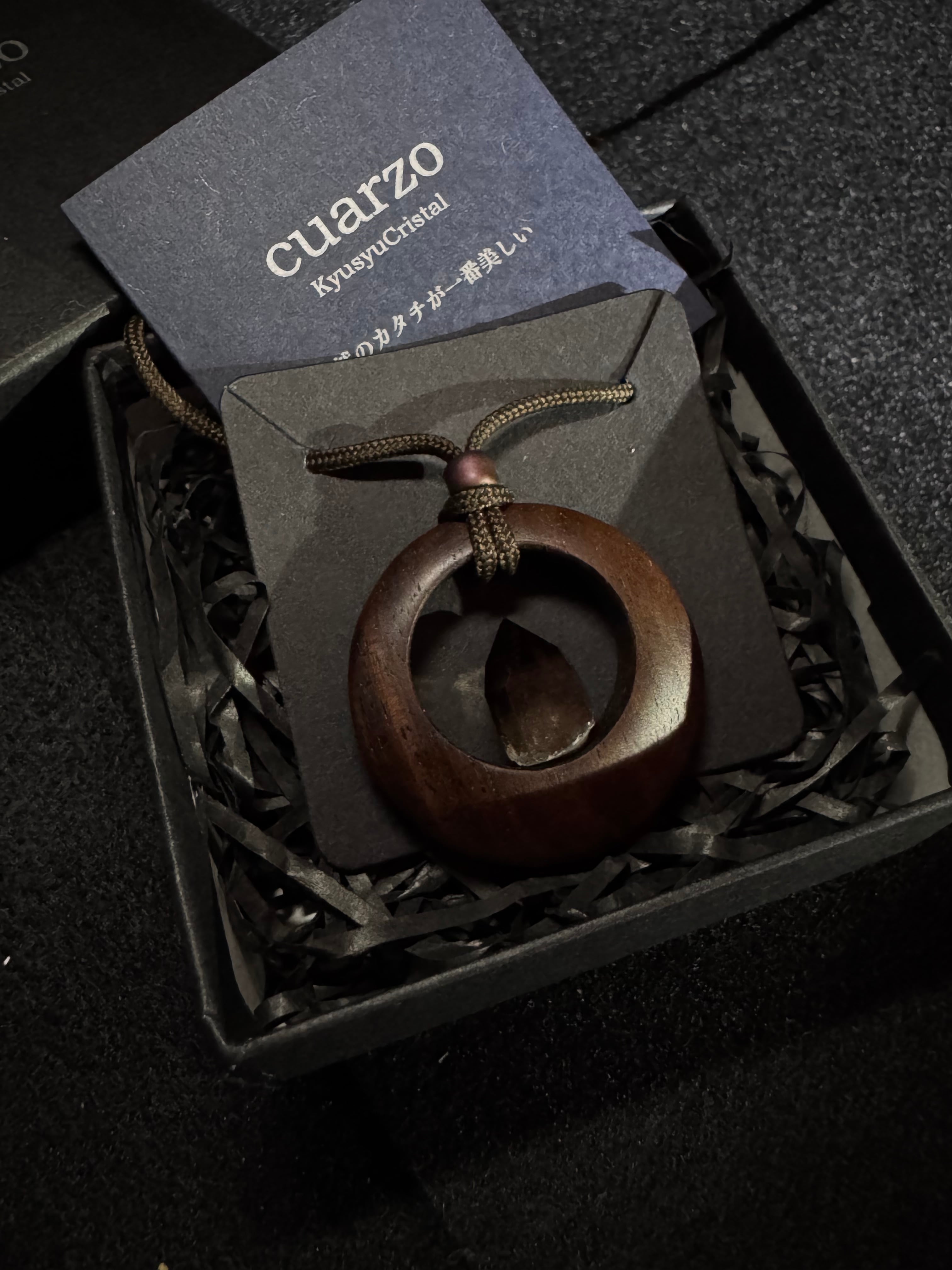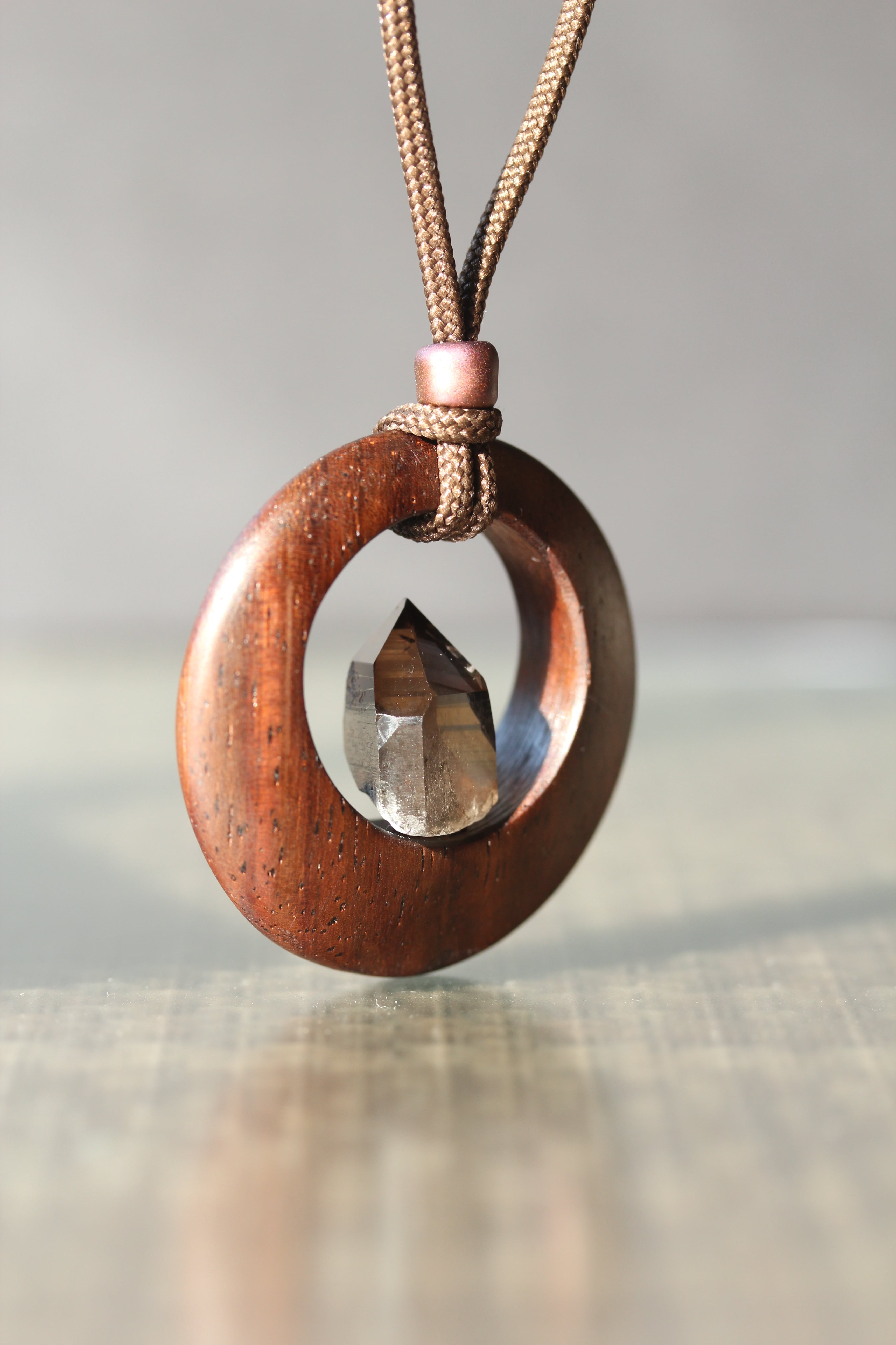【商品説明】:煙水晶の原石と高級木材のローズウッドを使用したペンダント。モリオンほど漆黒ではないけど、黒に近い透明感のある宮崎産煙水晶です。コロンとした姿が愛らしい
