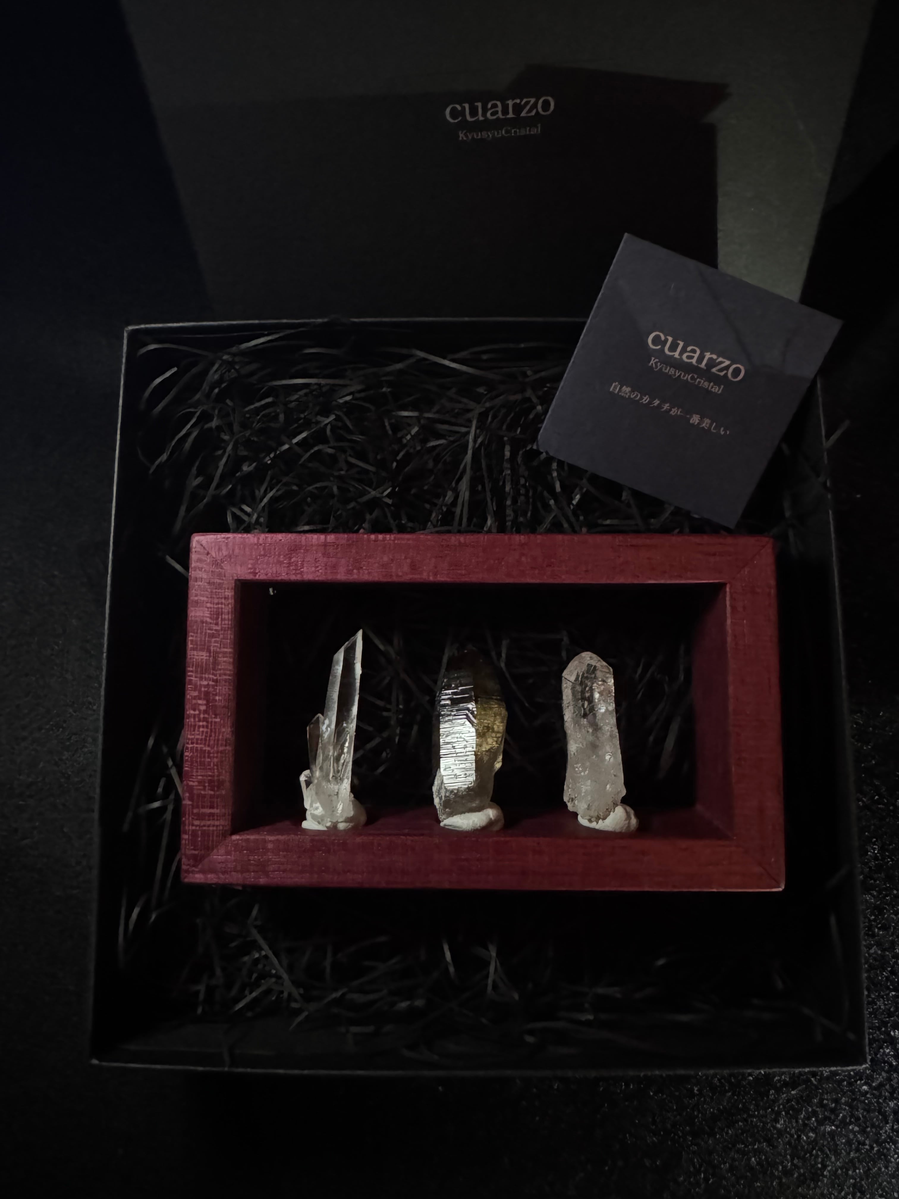 1:コロンビアレムリアンを彷彿させるような透明度が高い宮崎産水晶。ギューンと伸びたポイント水晶に、子供のような小さな水晶が根元に付いていて親子みたいでかわいいです