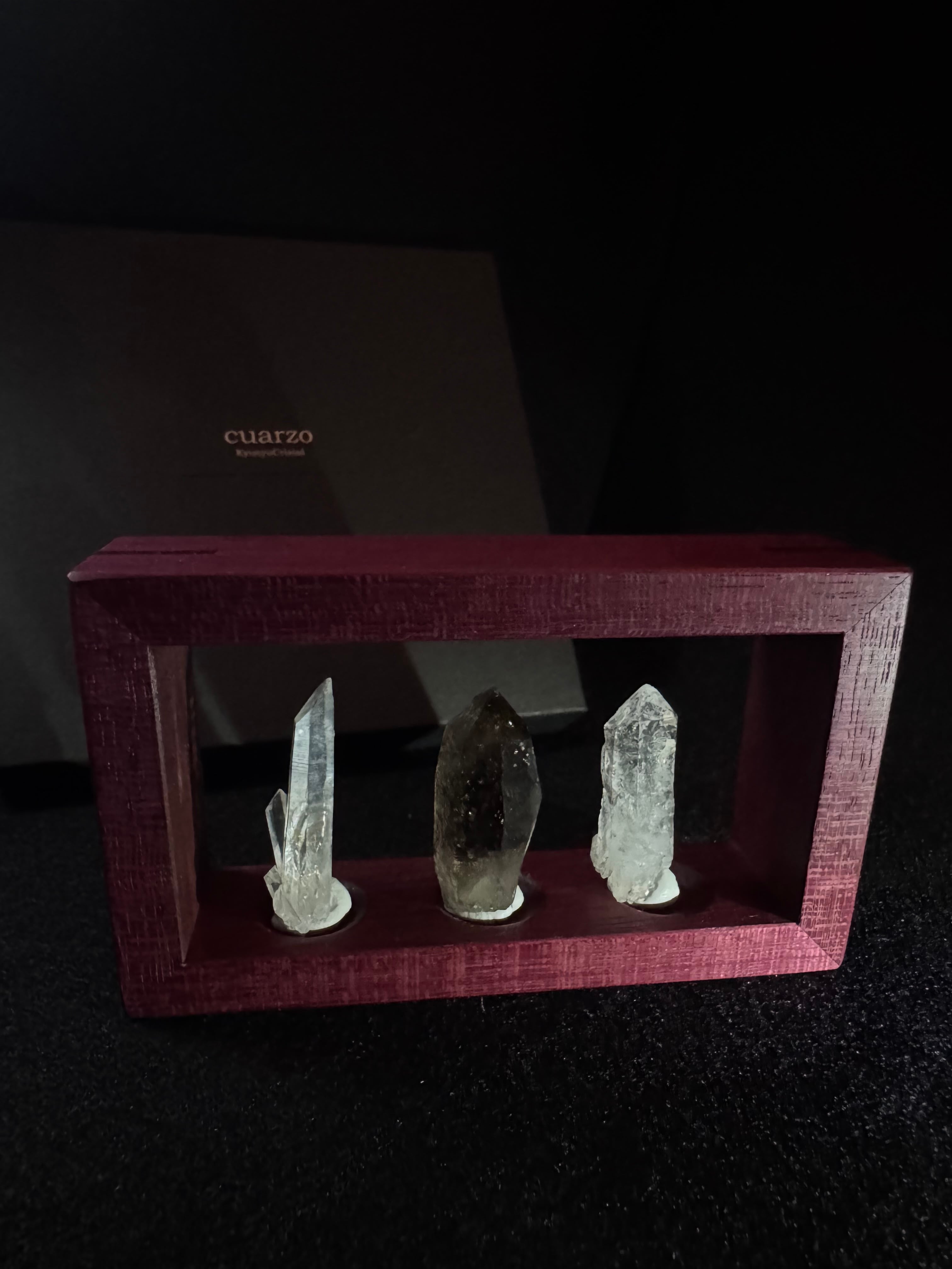 【台座の説明】:大きさ(約120x70x28mm)強度を保つ為、4つ角には「チギリ」と呼ばれる技法を用いています。4つの材を組み合わせ後、角に切り込みを入れ、別の木材をはめ込み削っております。高級な額などに使われる技法です。ローズウッドの台座には、パープルハートとのチギリ、パープルハートの台座には、ローズウッドのチギリを入れております。水晶を置く部分には「座ぐり」と呼ばれる円形の溝を掘っております。簡単のように見えますが、硬い木材のローズウッドやパープルハートに、同じ間隔で同じ深さの溝を掘るには、非常に高度な技術を用います。木工歴50年の職人が成せる技です